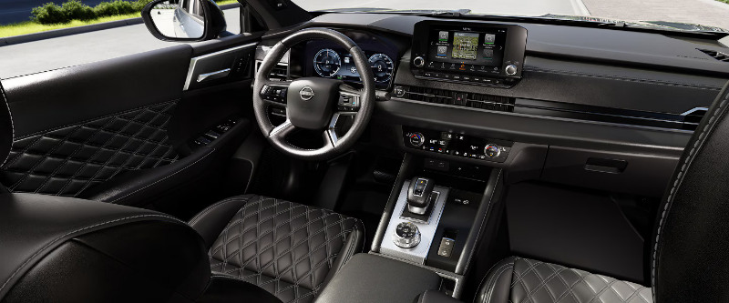 The interior appears to be one of the vehicle’s strongest areas. Nissan’s own materials emphasize standard third-row seating for seven, and the detailed specs show a 40:20:40 split second row along with a fold-flat third row. That is a smart configuration because it gives owners more ways to balance passengers and cargo without feeling locked into one setup. Heated front and rear seats, a heated steering wheel, leather-appointed seats, an 8-way power passenger seat with power lumbar support, rear door sunshades, and a power panoramic sunroof all point to a cabin designed with comfort in mind. A rear-seat 120V 1500W outlet and a trunk-mounted 120V 1500W outlet also add a genuinely useful touch for families, gear-heavy road trips, and outdoor use.